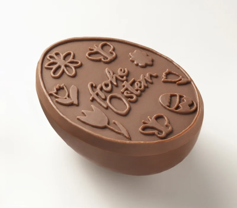 Egg shaped chocolate embossed with standard Easter designs with/or your logo.