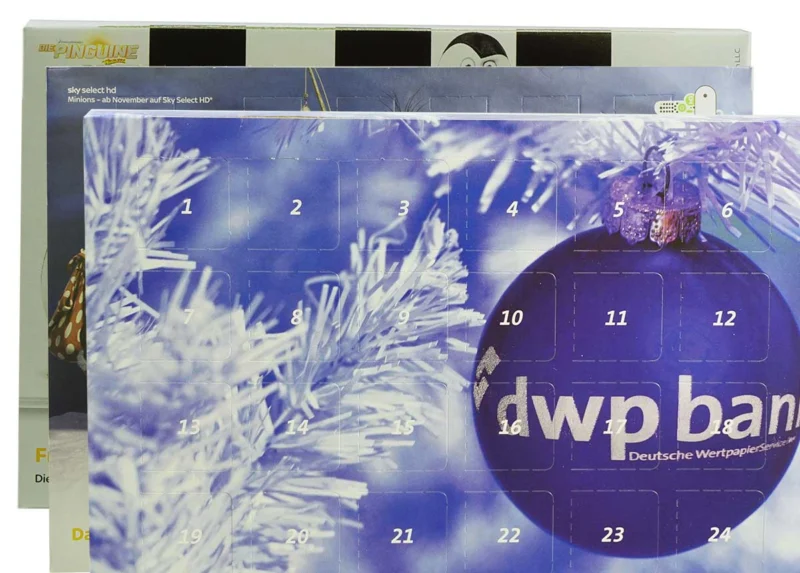 The Individual Budget Advent Calendar ( 206 x 140 mm ) is an ideal gift on your customer’s desk . For 24 days , your customer enjoys fine Belgian chocolate and has thereby your company colors before his eyes . The calendar is equipped with a fold-out stand leg.