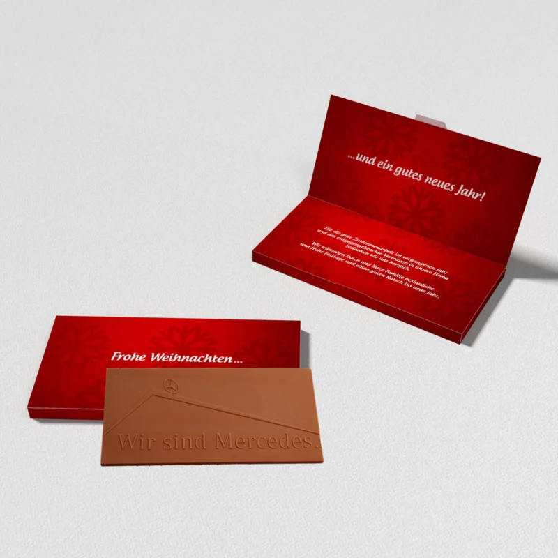 The chocolate and the greeting card individually produced according to your design and printed with the addresses you provide us post ready.