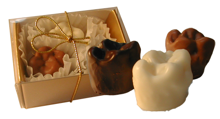 Three chocolate teeth in three different flavors of milk, white and dark chocolate, which can be chosen individually.